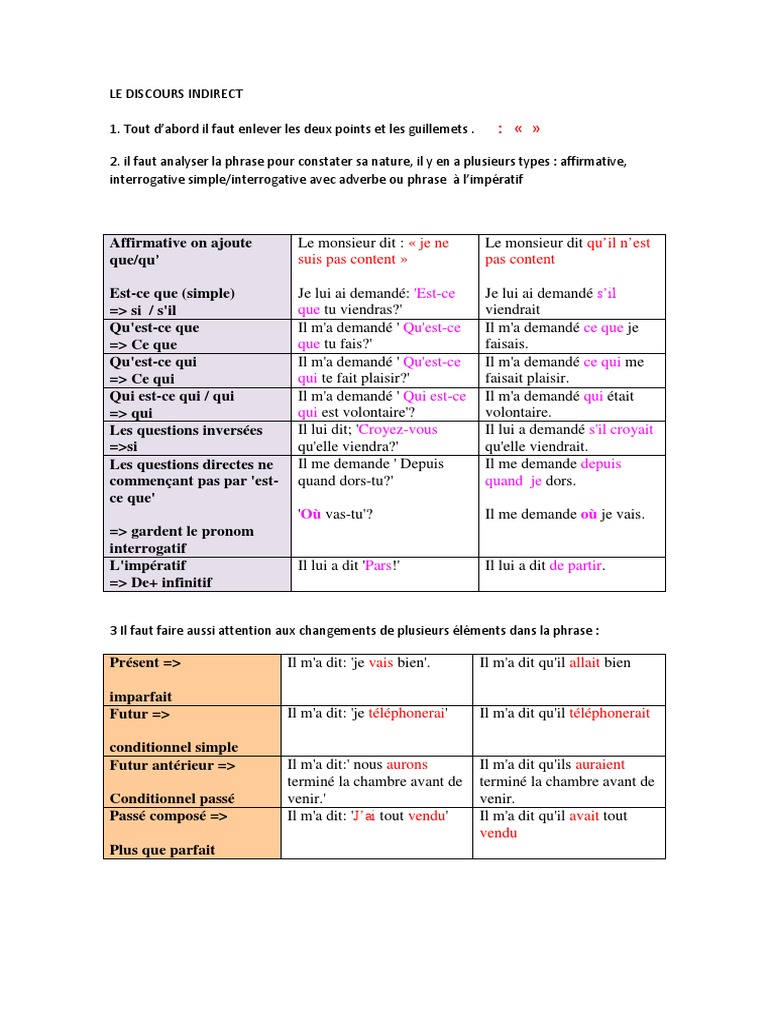 Le discours indirect est utilisé pour rapporter des paroles prononcées au style ou discours direct. Le style indirect est employé pour rapporter des paroles. Le docteur m'a dit que j'avais des problèmes dans la gorge. Complétez le discours indirect en changeant le temps du verbe dans le discours direct